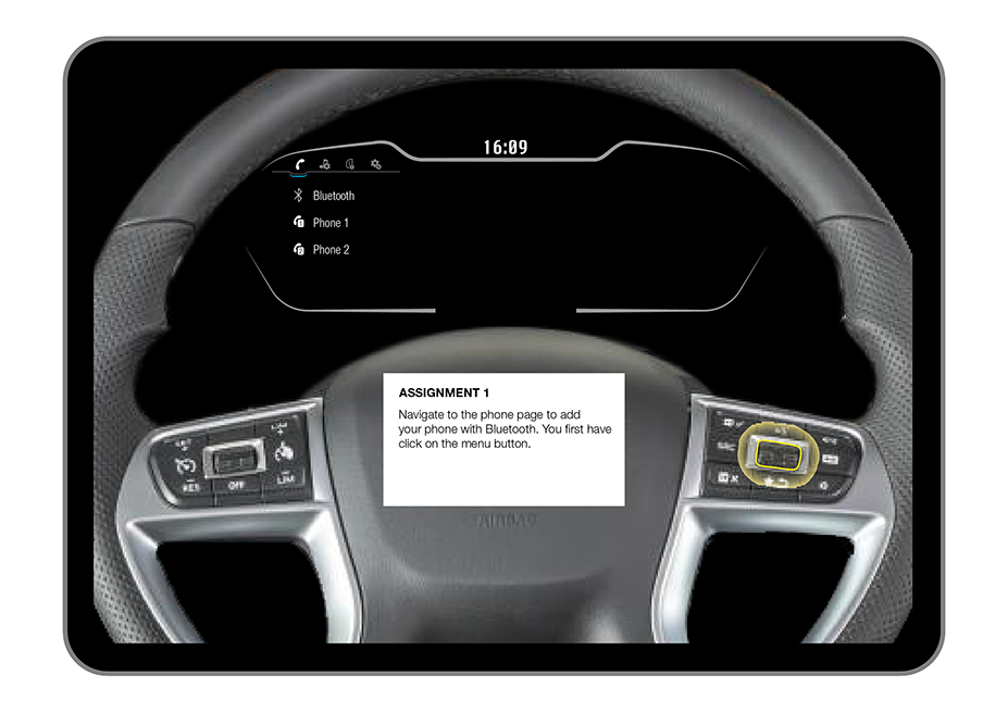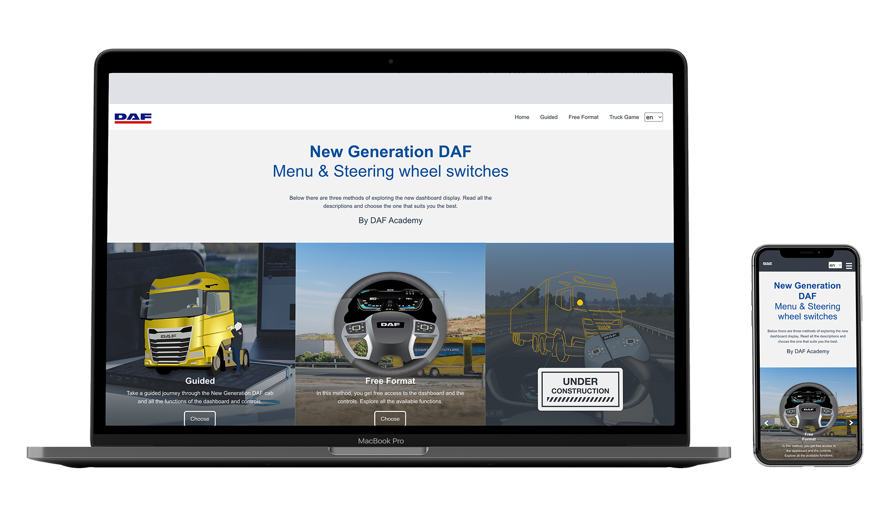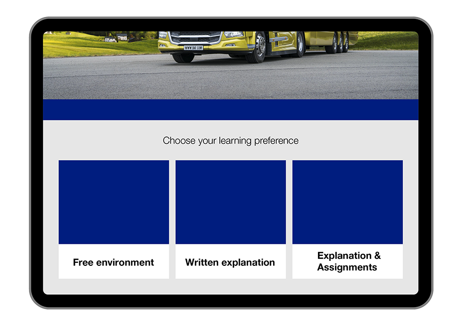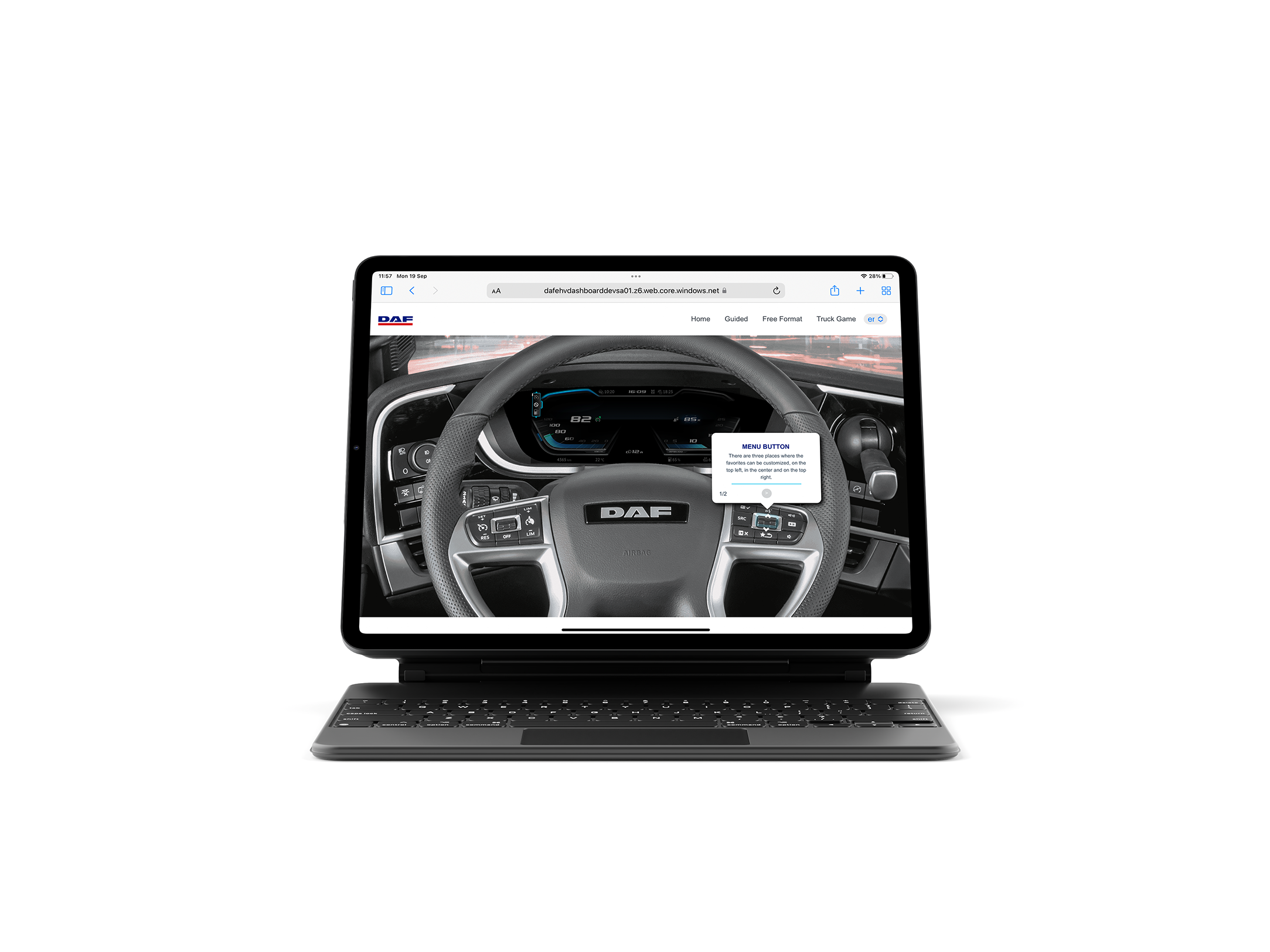 With this information, I brainstormed and created several concepts to present to the DAF stakeholders. In the end, we decided on the "Customization Fits All" concept. Customization strengthens the bond between customer and product because the product is customized to the customer's personal needs. When the target audience opens the application, they are given multiple learning options: Free format, where they can freely explore and receive an explanation of the controls. With the Guided method, the user receives several lessons about the controls and must click on the correct controls during the lessons.