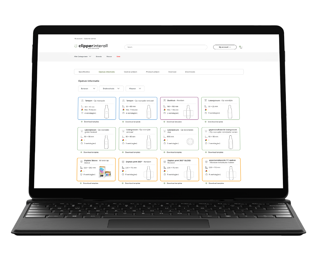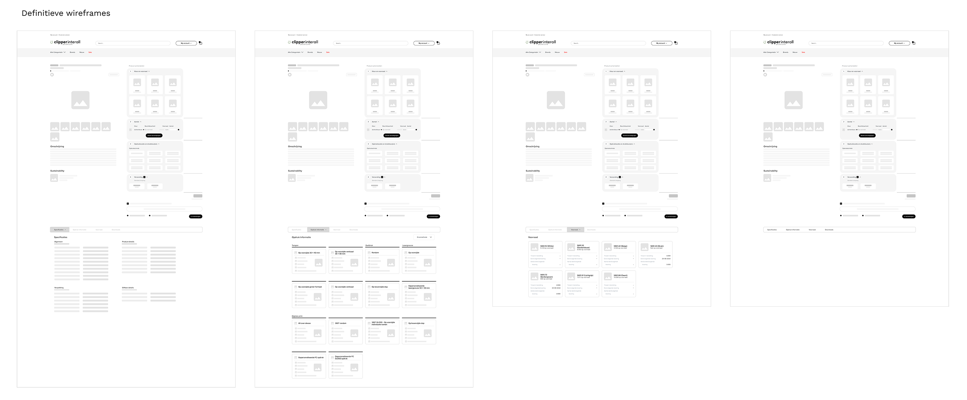 De productpagina (PDP) op de Clipper Interall website, heeft onderaan een informatiebalk. In deze informatiebalk staat alle informatie genoteerd over een product die een klant nodig heeft om dat product te bedrukken en te bestellen. Denk hierbij aan: specificaties, opdruk informatie, opdruk prijzen, voorraad, etc.
